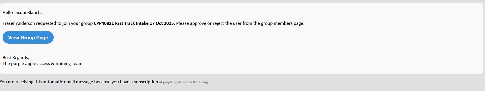 I have set up a private group from the front end of the website and people are applying to join it. That is working and I am receiving an email notification advising that I have an approval request.